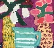Sophie paints with a certain pace, mixing colours directly on the canvas and limits her palette to primary colours to simplify her process. This is evident in the five gorgeous new works she has created for Forman, including a light turquoise kitchen scene titled “Put it on the list.” There's a sense of nostalgia to this artwork, pastel colours suggestive of 50s decor and the clock, a reminder of passing time. The pale yellow outside the window could be a sunrise, the scene depicting the moment you wake, walk to your kitchen and make coffee. Stillness before the rest of the house wakes. It captures something we can all relate to. Sophie describes her distinctive style as expressive, colourful and varied,